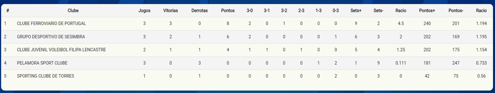 Clube Ferroviário de Portugal 3 – 0 PEL Amora com os parciais de 25 -14; 25-11; 20-25; 22-25 e 13-15.